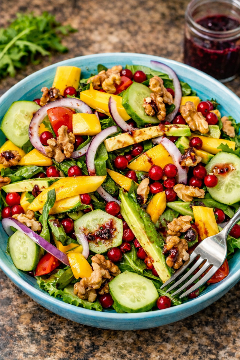A fresh, vibrant salad bursting with juicy mango, crisp greens, red currants, and nourishing textures — light, refreshing, and naturally satisfying. 🌿