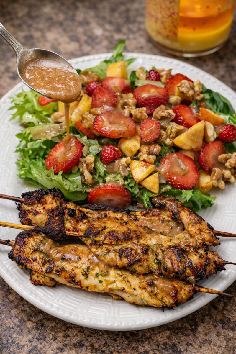 A fresh but comforting orchard-style meal with savory chicken thighs, naturally sweet fruit, vibrant greens, and a simple peach balsamic dressing — nourishing, satisfying, and the kind of wellness food that actually fits real life.
